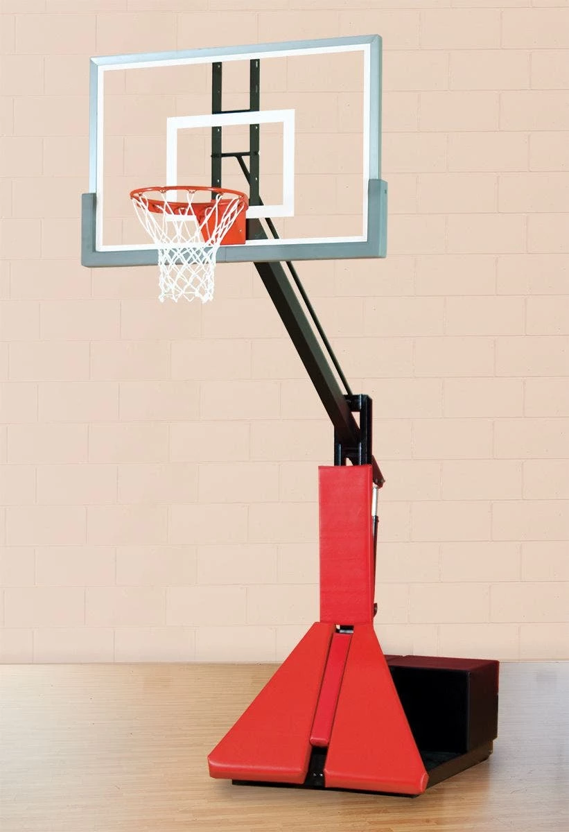 System includes 850 lb ballast to keep the unit stationary and upright during play. Padding on the base and front of the post protects players if they run into it. When games or practice wrap up, remove the ballast and fold the system for convenient transportation and compact storage. When folded, the system rolls through a standard double door. Wheels under the base make it easy to roll the entire system into place and lock for stability.