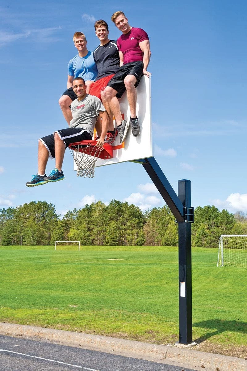 Featuring a deep setback, thick post, and strong construction, these Bison basketball systems are the gold standard for top-tier quality! A 5′ setback prevents players from making contact with the pole as they go in for a layup. In-ground system includes a powder-coated, 6″ sq steel post that’s ready for high levels of play. Front-mount goal offers no flexibility for more durability.