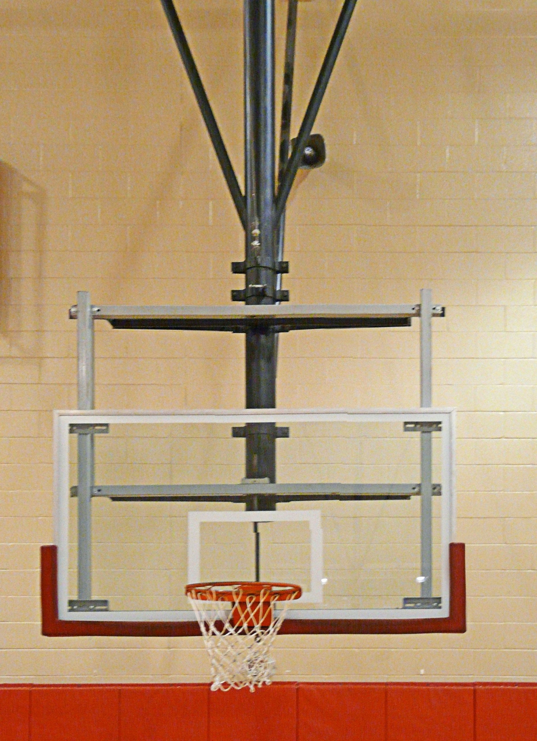 Powder-coated gray finish gives the system extra durability. Install the framework between the backboard and its corresponding support structure. If adding this system to an existing court, the backboard will be moved 4-1/4″ toward the free throw line.