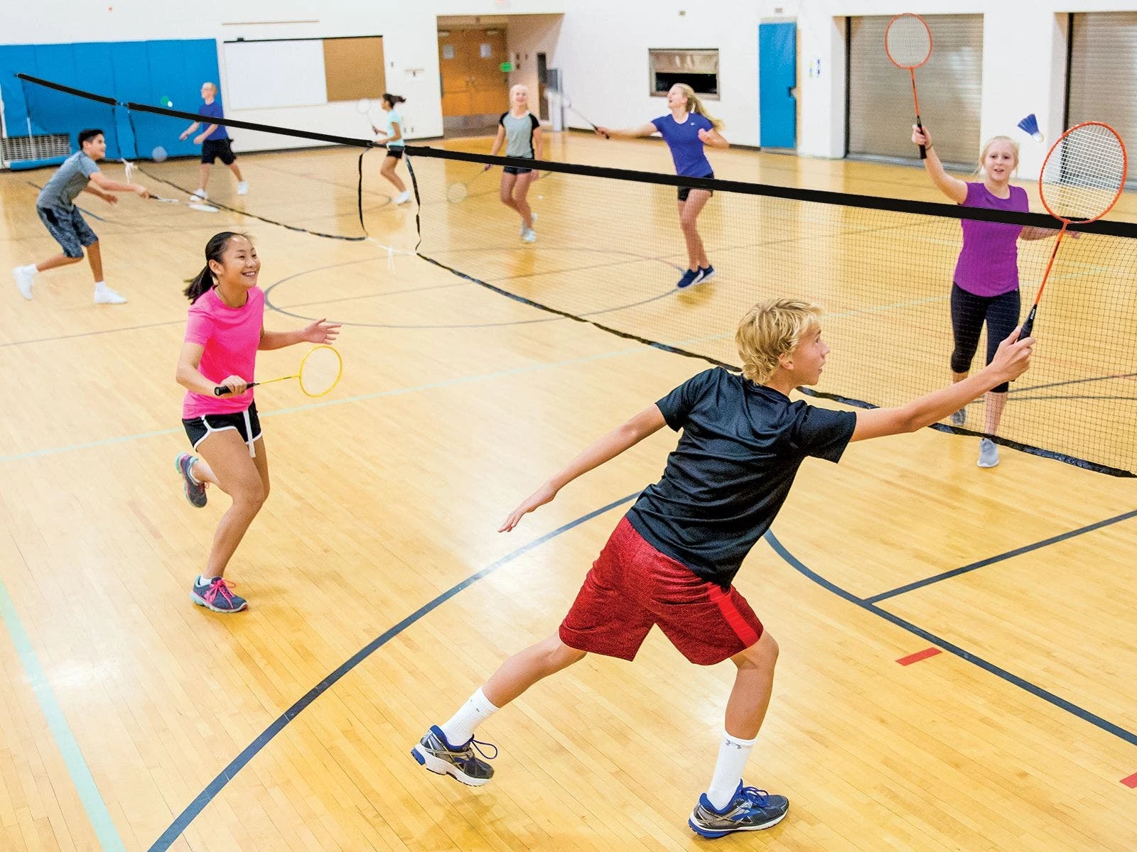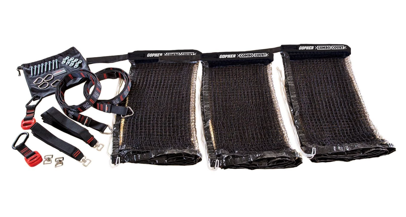 System includes 3 custom badminton nets (21’L x 30″H), tether strap system, mounting hardware, wall brackets, and storage bag for tether straps. If you’re gym has extra space, an additional net is also sold separately to expand the entire system up to 4 nets total.