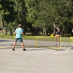 The official size pickleball net sets up within minutes on a tennis court, black top, or indoors on a gym floor. Complete Set includes net (20’L x 20’W x 36”H), poles, stainless steel frame, 4 maple paddles (7”W x 15-1/2”H), 3 outdoor pickleballs, convenient storage bag, a set of boundary markers, and activity instruction. Entire system is 29 lb.