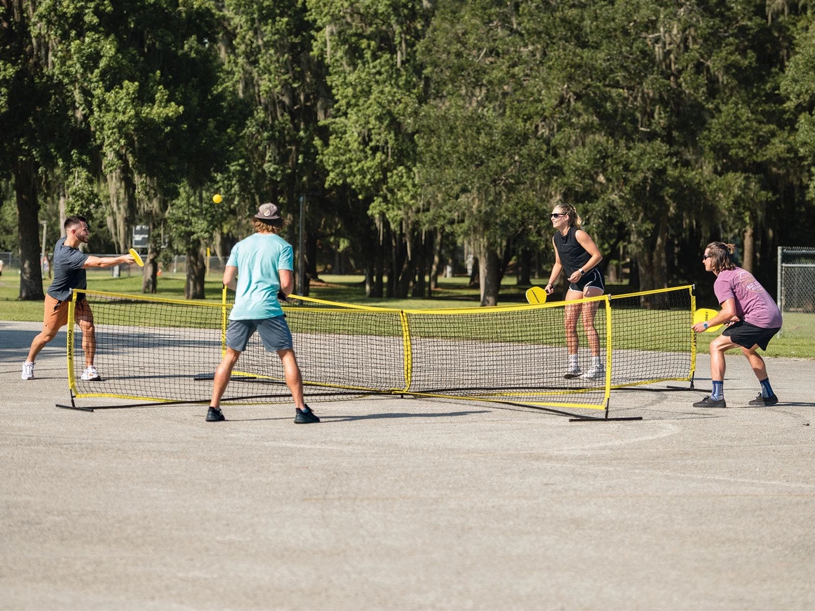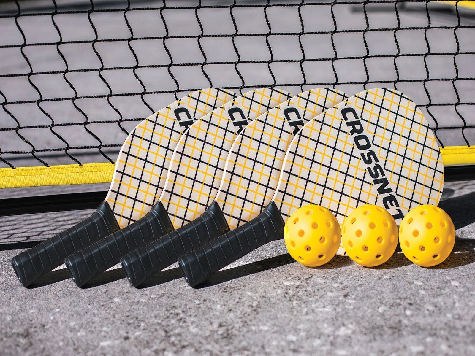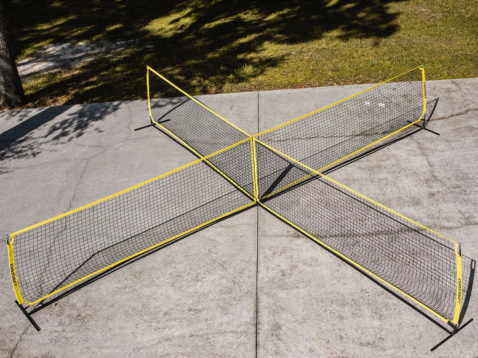 Put a spin on your pickleball unit with a net that divides the court into four sides for an engaging CROSSNET game. One player stands in each quadrant and game play can follow team or free-for-all rules. A volley begins when one player serves the birdie to a player in another square. When it lands in a square, the last player or team to hit the birdie, scores. Players switch squares after each point. The first team to score 11 points, wins!