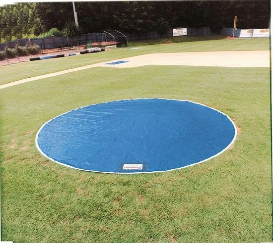 A 10′ dia mat covers a 6″ mound, while a 12′ dia mat covers an 8″ mound to fit the needs of any baseball or softball field. Use built-in grommets to stake or weigh down the cover. Stakes sold separately. Specify color of cover when ordering.