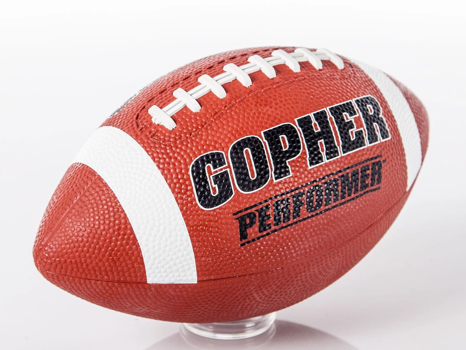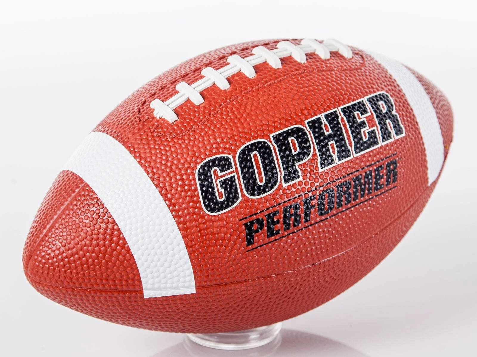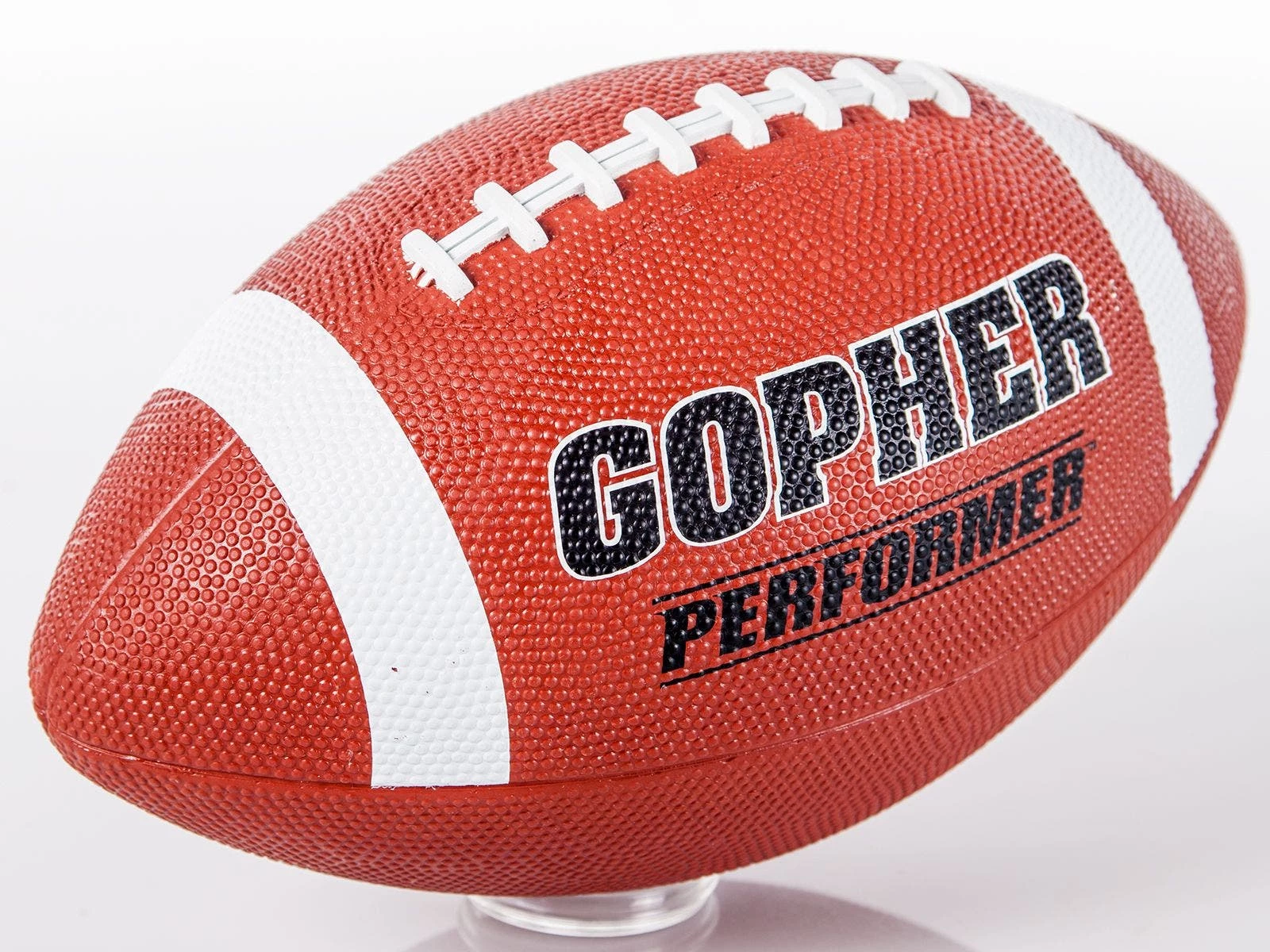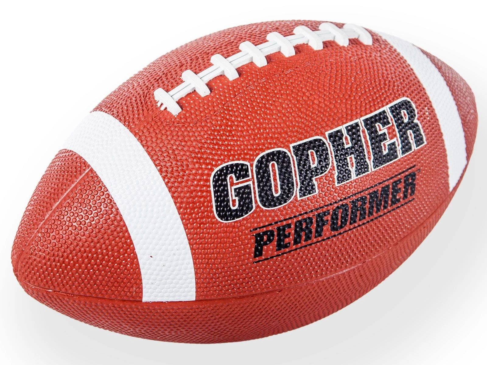 Deep pebbling and raised laces on this football give students excellent grip for more control during passing. This is our most preferred Gopher rubber football, popular in camps and PE classes.