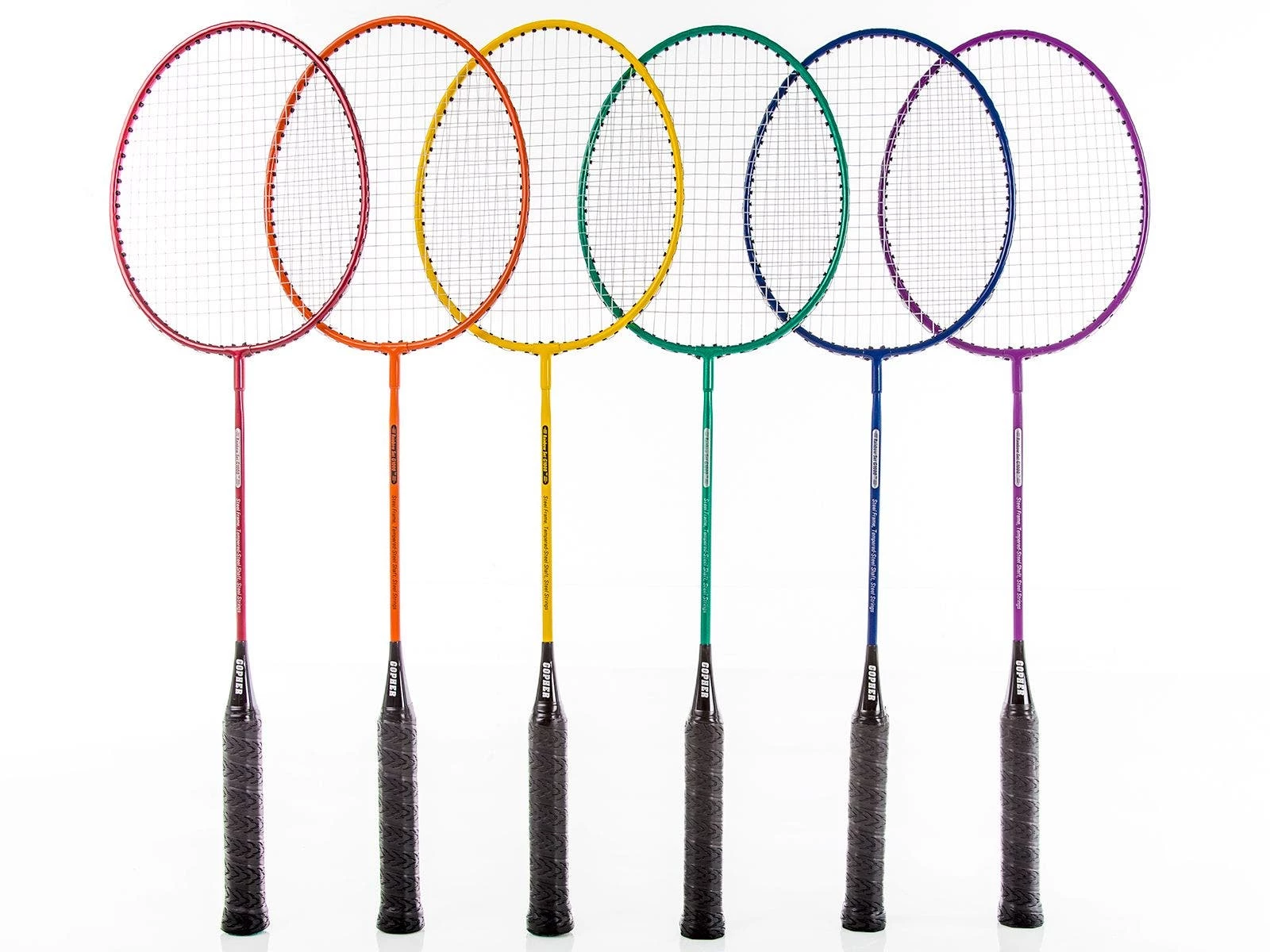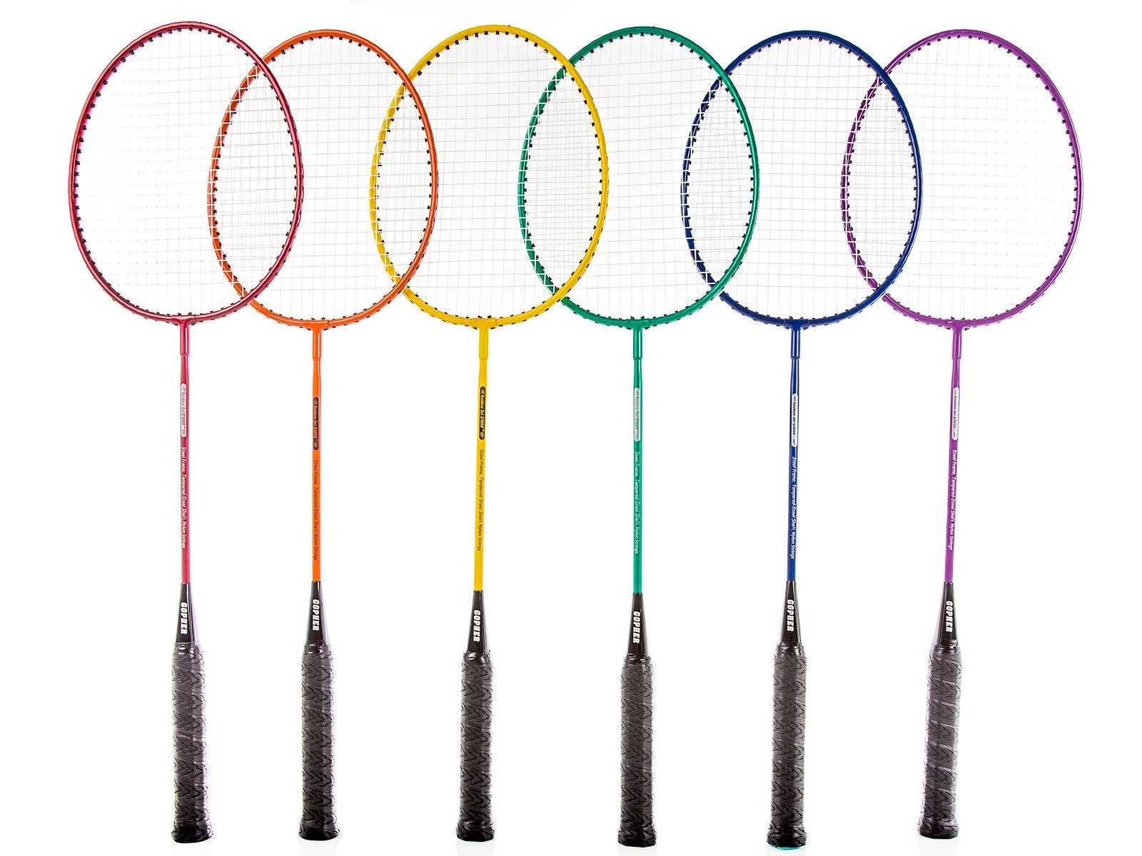 Quickly organize teams or set up skill stations with badminton racquets in six bright Rainbow colors. Aluminum/steel construction provides durability, while an oval head helps students connect with shuttlecocks. Choose between braided-nylon and coated-steel strings to tailor racquet performance to the needs of your class.