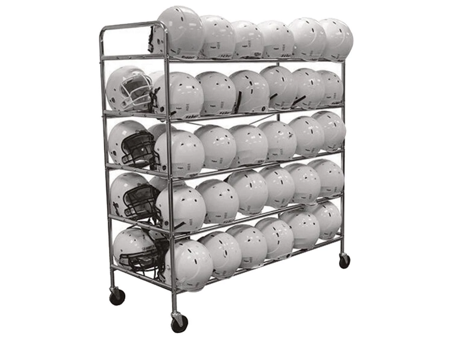 These convenient helmet racks offer easy solutions for storing helmets on the go. Take a rack to the practice field and away games, or keep it on your home turf to organize a team’s worth of football helmets. Its rugged, all-welded steel base with a durable finish withstands even the harshest weather conditions. Four 4″ dia non-marking, swivel casters make for easy portability on a variety of surfaces.