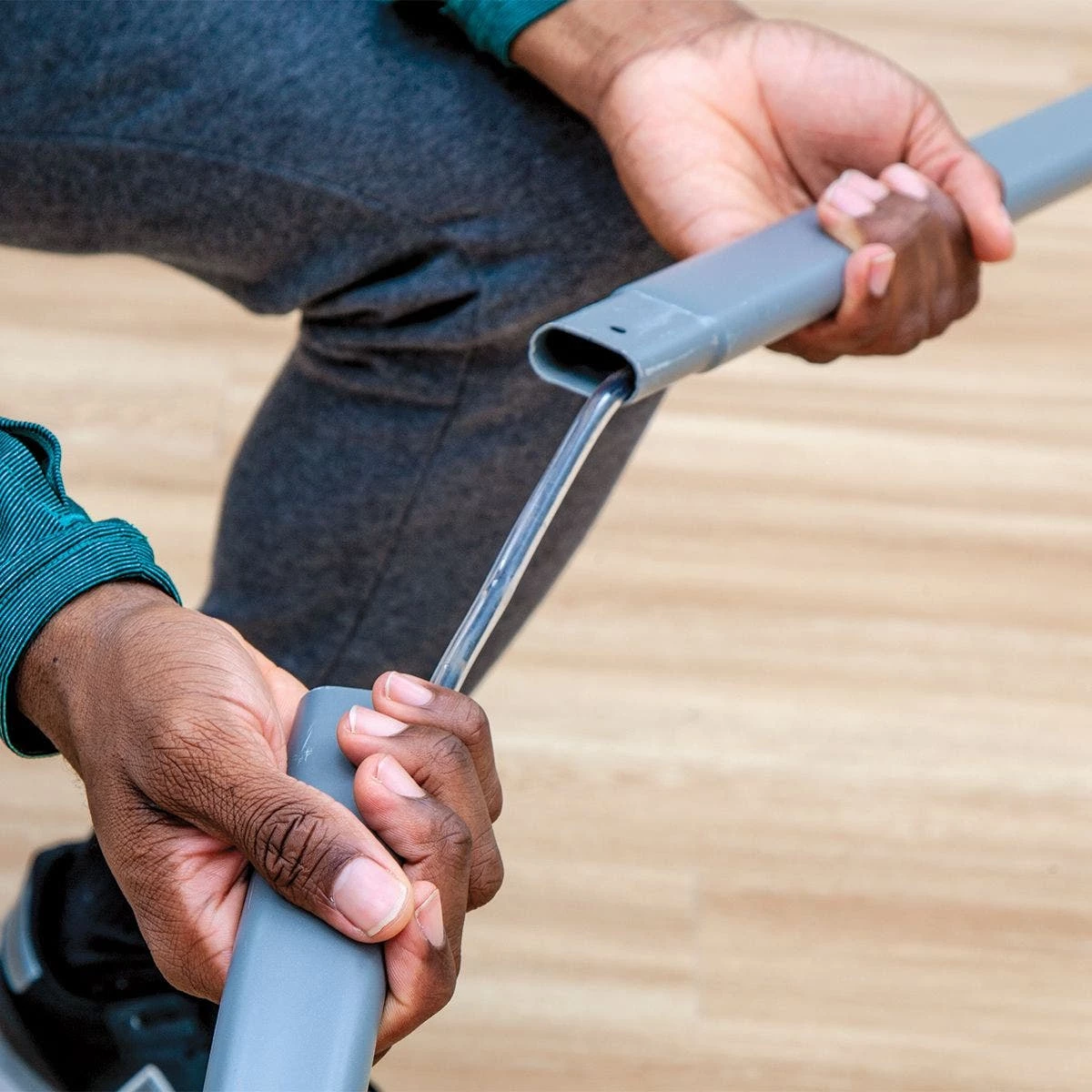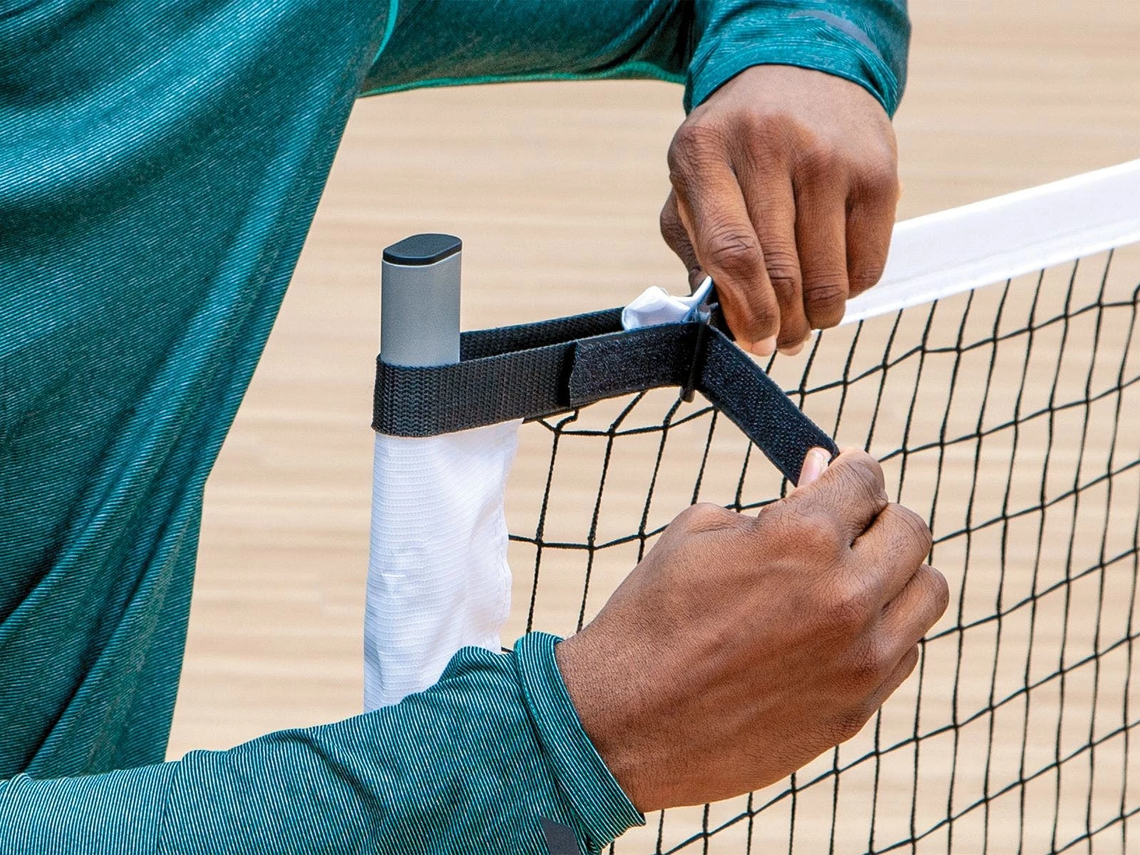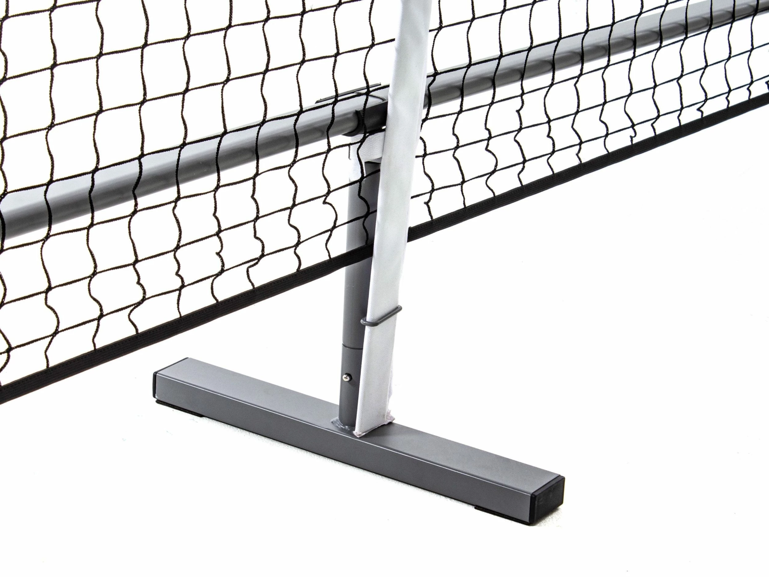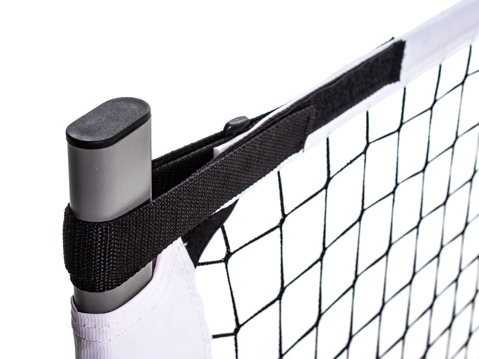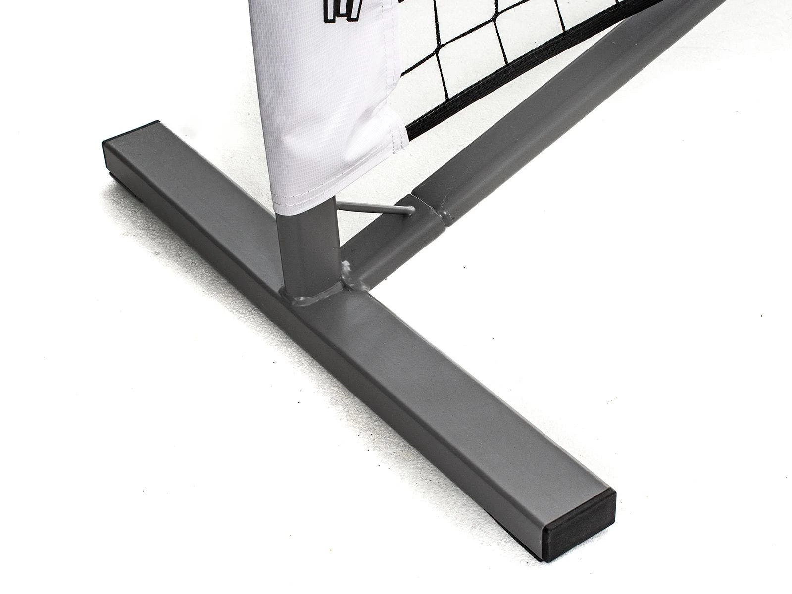 A bungee cord inside the tubing makes assembly quick and simple. The cord keeps pieces together, so you always know which piece to connect next and eliminates the concern of lost pieces. Gray, powder-coated steel frame features oval tubing for enhanced strength and longevity. A base bar along the bottom of the net keeps the net in place. Center support leg adds stability. When games end, store and transport the entire system in the included storage bag. System is 22’W x 36″H; 26 lb. Replacement Net is sold separately.