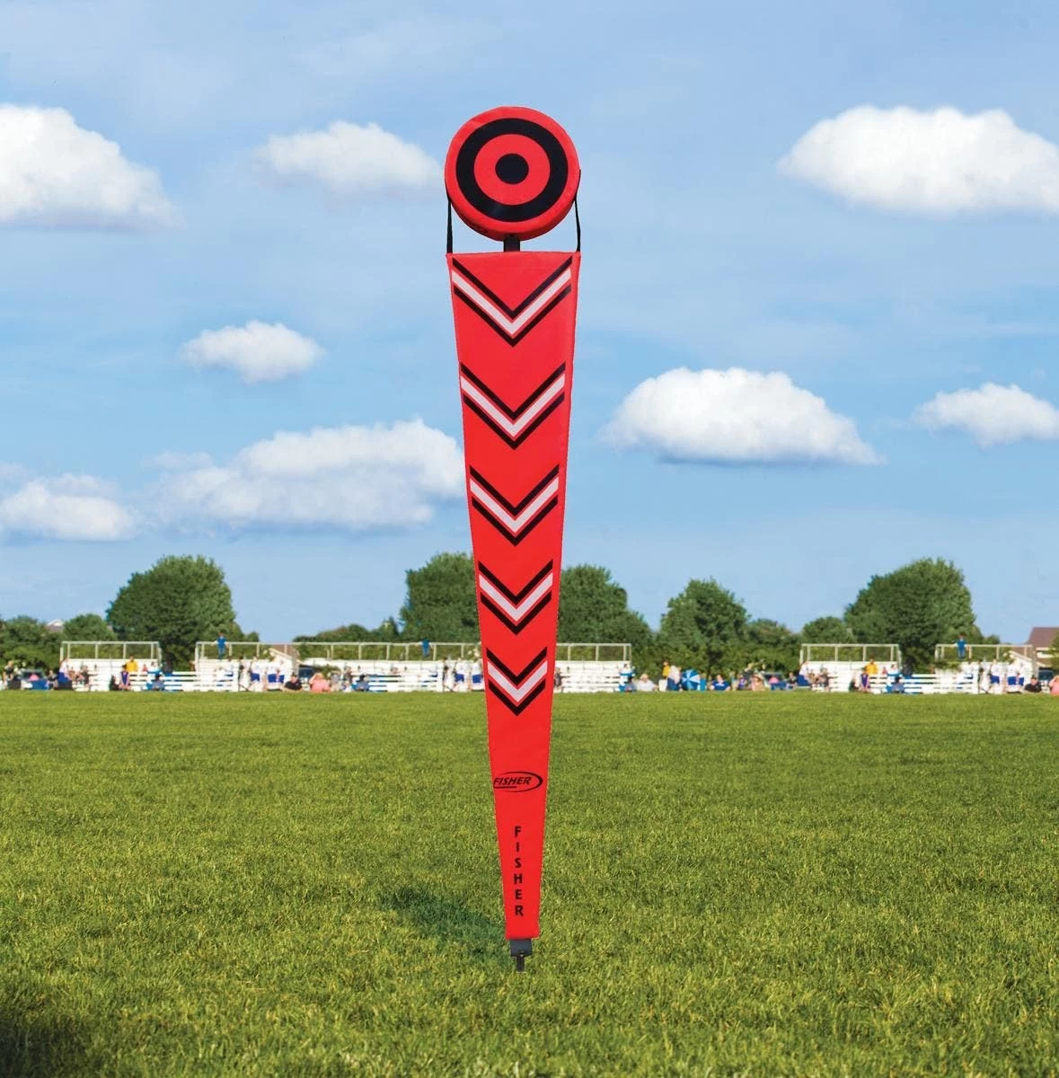 Bright orange, 3″ thick polyfoam bulls-eye on the top of the pole is highly visible from any point on the field. The bottom of the pole includes crutch tips to protect the field and players.