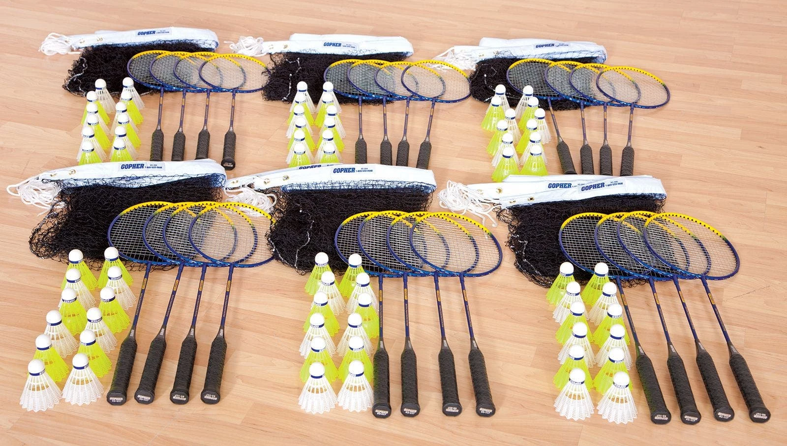 - 6-Court 24-Player Set. Includes 24 G1000 Racquets (26″L), 6 Gopher Recreation Nets, 72 Gopher S1 Recreational Shuttlecocks.