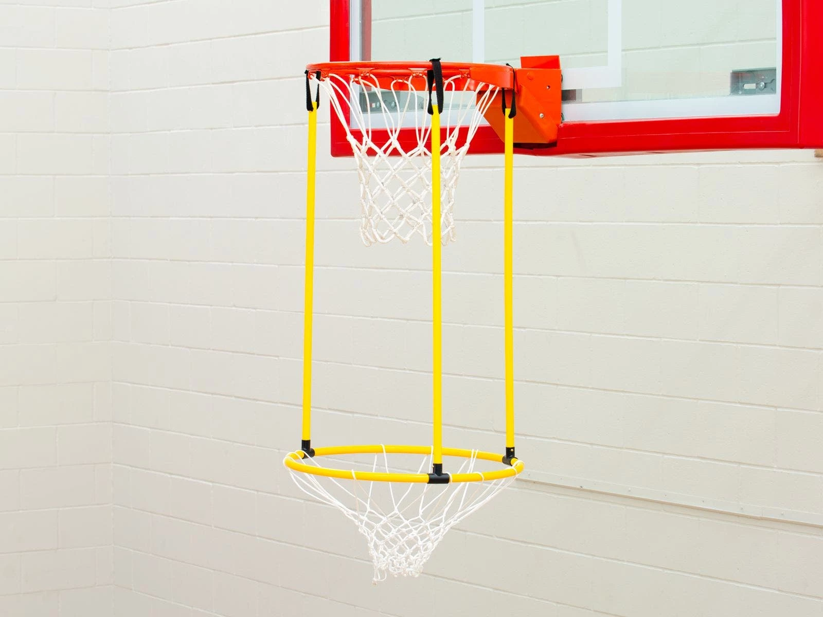 When you want to lower the goal for younger players, but don’t have an adjustable system, this hoop is your answer! It attaches to your existing basketball goal via hoop-and-loop fasteners for quick and easy setup. The 22″ dia goal lowers the hoop by 30″ for increased success for beginners. Constructed of lightweight, 19 mm polypropylene tubing for long-lasting use. Includes a white, 4 mm brained-nylon net.