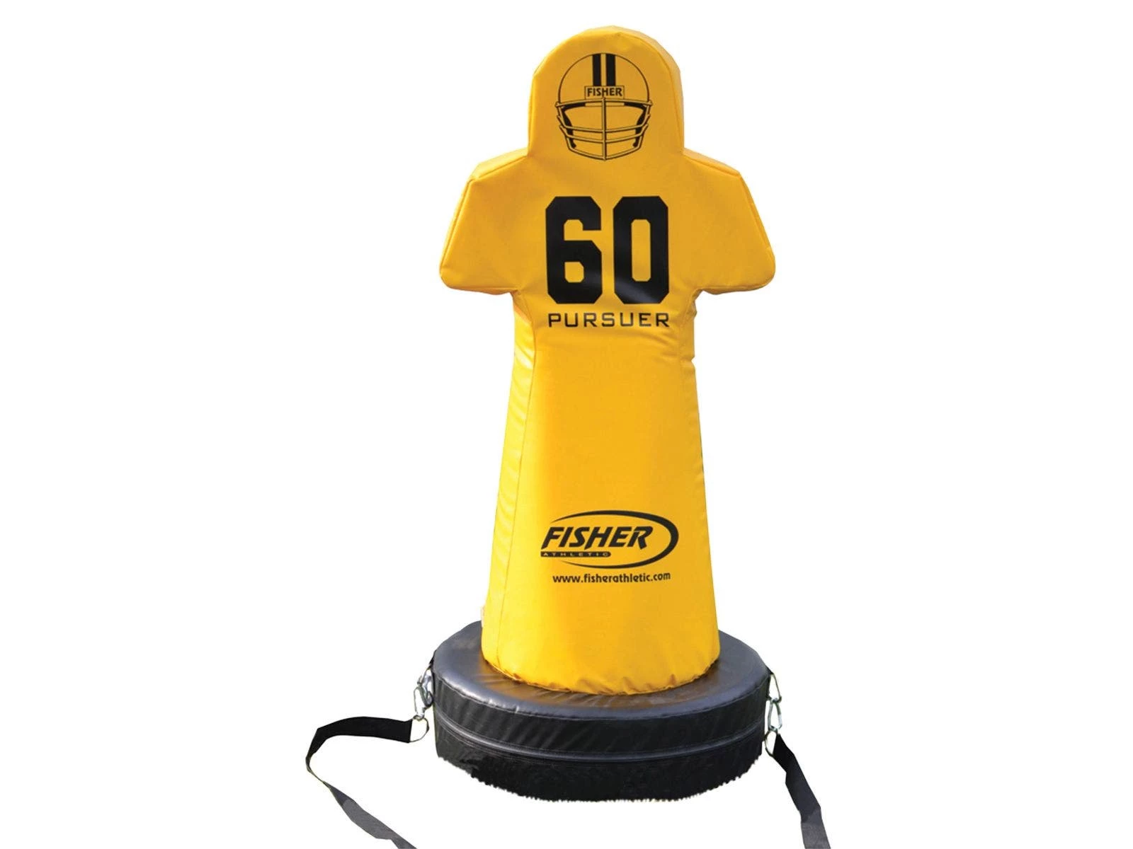 This heavy-duty football training equipment encourages players to learn proper form with a moving target. One player pulls this trainer while running to simulate in-game movement, as another pursues and tackles it while in motion. The target disconnects from the base to protect the runner from sudden stops. All foam construction for additional safety during drills. Specify color when ordering. 28″W x 62″H; 19 lb